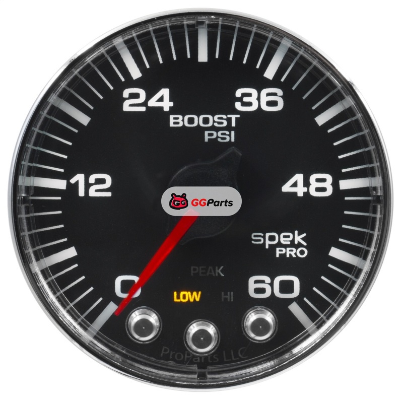 Autometer Spek-Pro Gauge Boost 2 1/16in 60psi Stepper Motor W/Peak & Warn Blk/Chrm