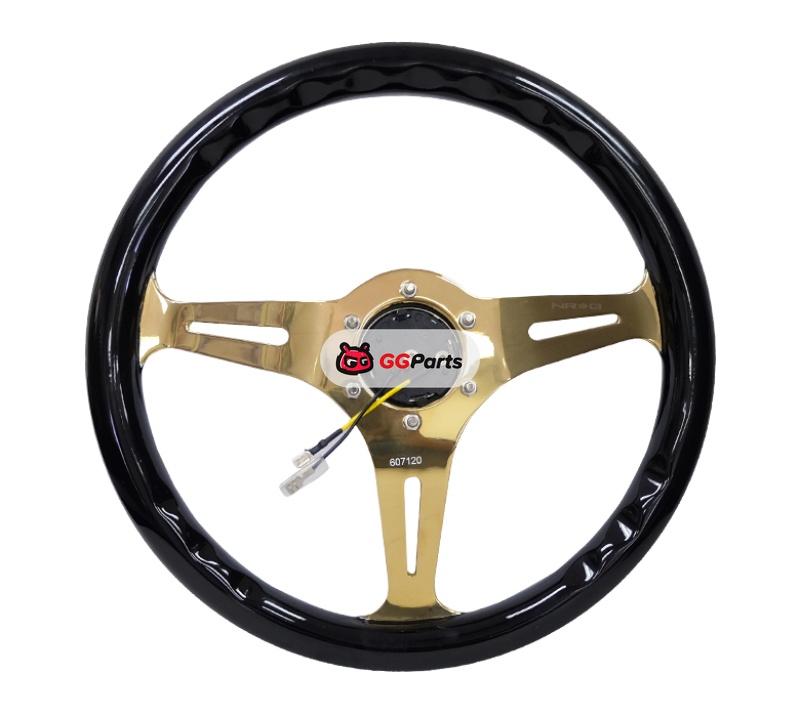 NRG Classic Wood Grain Steering Wheel (350mm) Black Grip w/Chrome Gold 3-Spoke Center