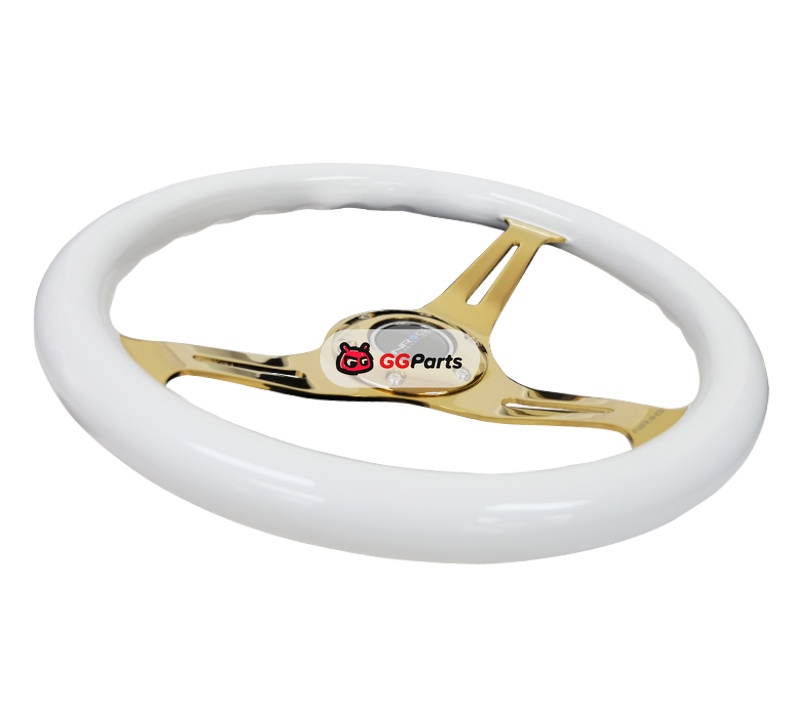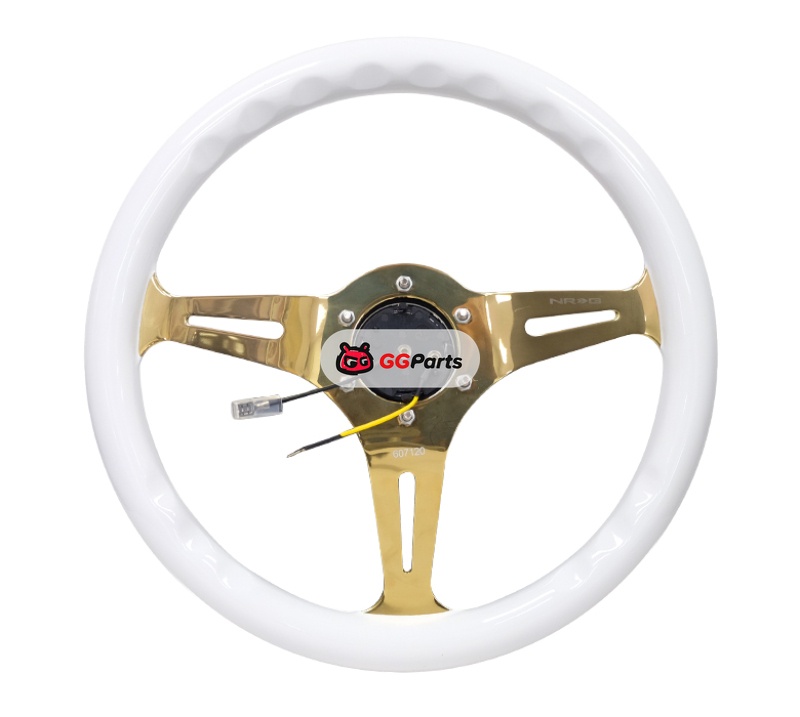 NRG Classic Wood Grain Steering Wheel (350mm) White Grip w/Chrome Gold 3-Spoke Center
