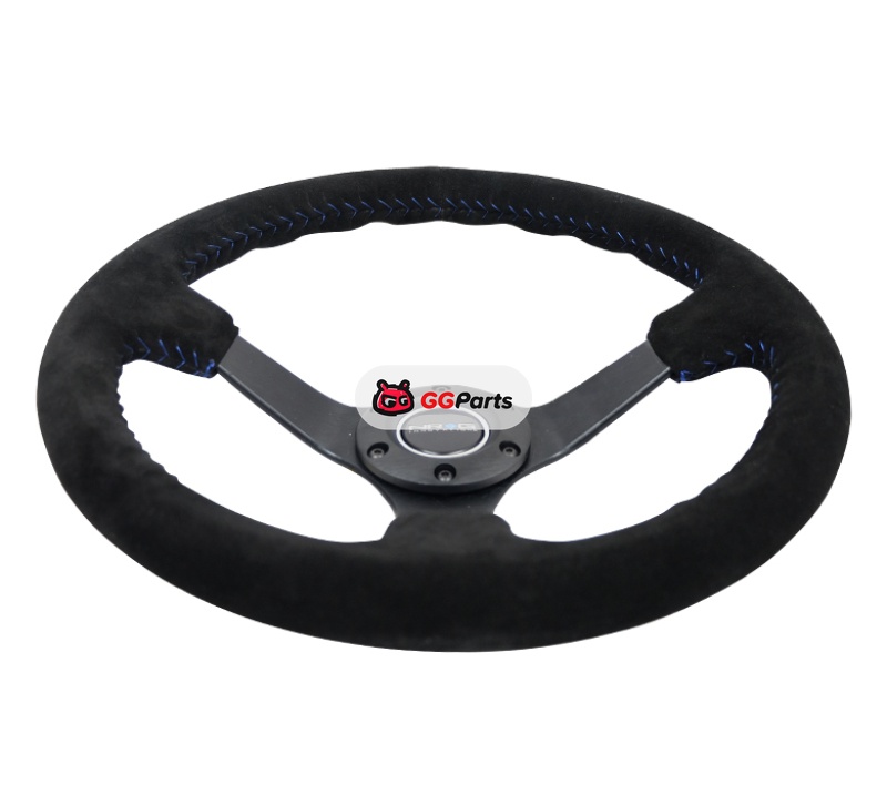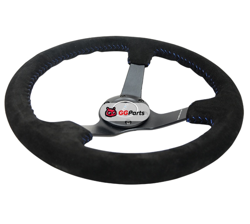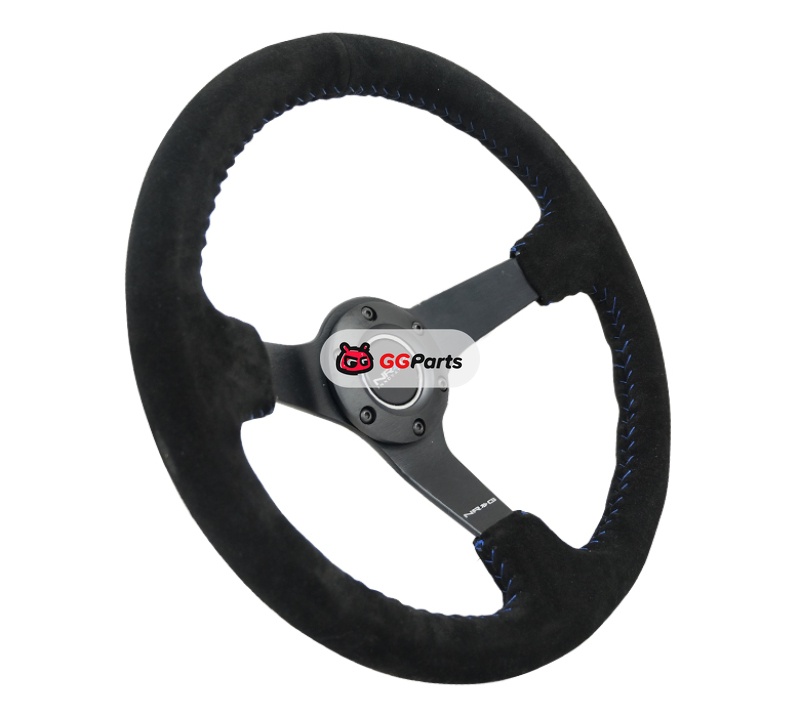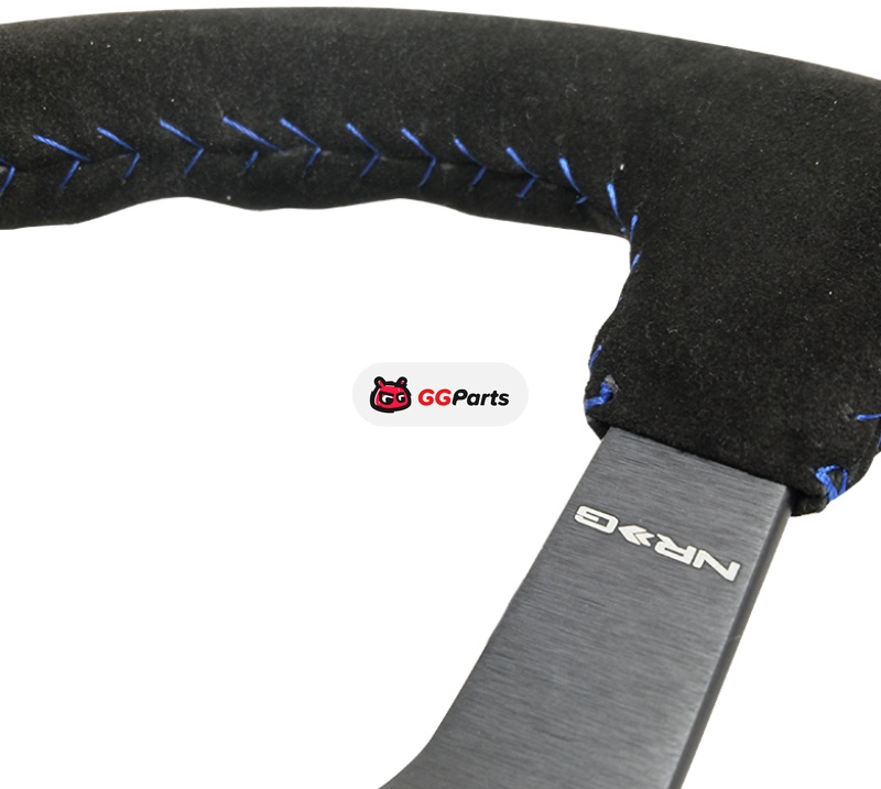 NRG Reinforced Steering Wheel (350mm / 3in. Deep) Blk Suede/Blue BBall Stitch w/5mm Matte Blk Spokes
