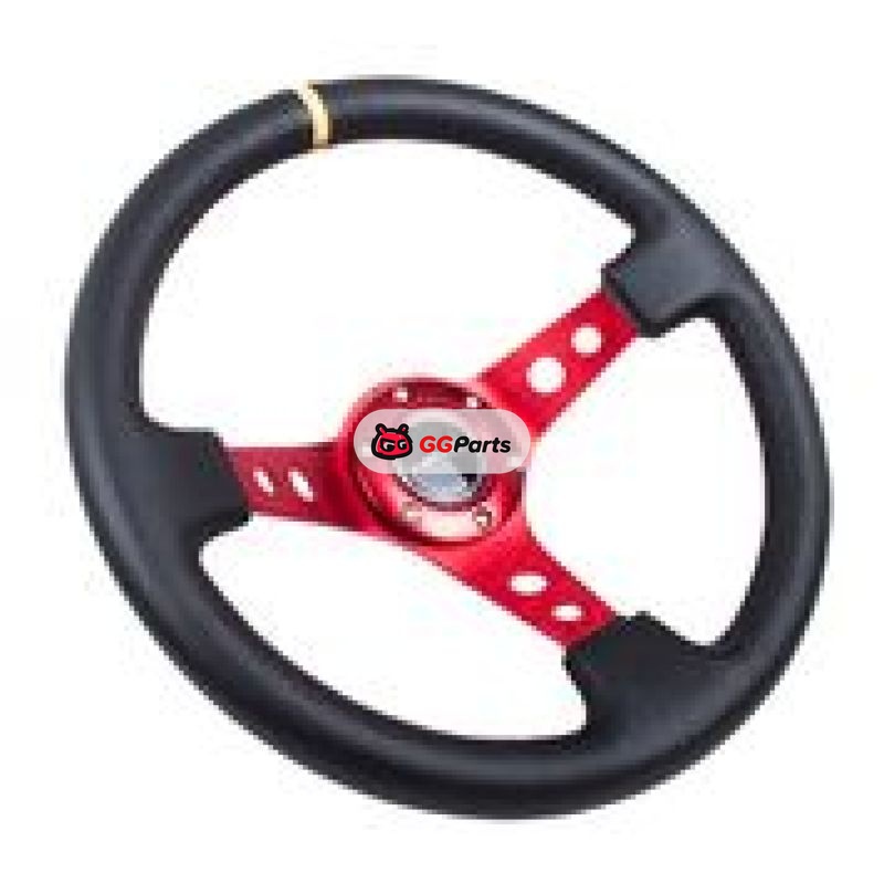NRG Reinforced Steering Wheel (350mm / 3in. Deep) Blk Leather w/Red Spokes & Sgl Yellow Center Mark