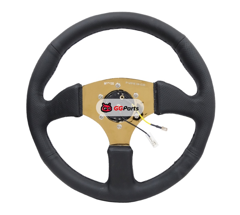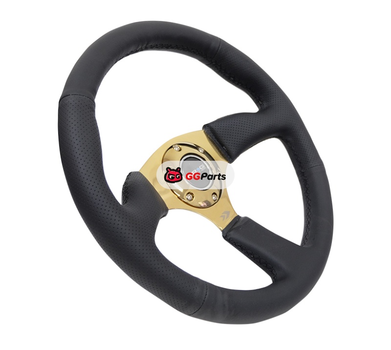 NRG Reinforced Steering Wheel (350mm / 2.5in. Deep) Leather Race Comfort Grip w/4mm Gold Spokes