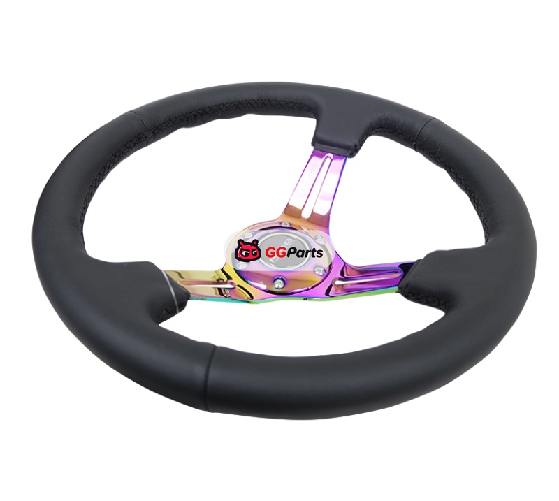 NRG Reinforced Steering Wheel (350mm / 3in. Deep) Blk Leather/Blk Stitch w/Neochrome Slits