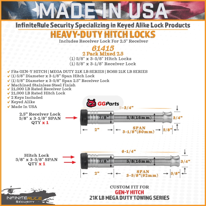 Gen-Y InfiniteRule (1) 5/8in x 3-5/8in Hitch Lock (1) 5/8in x 3-1/8in 2.5in Receiver Lock w/4 Keys