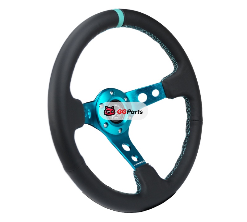 NRG Reinforce Steering Wheel (350mm / 3in. Deep) Blk Leather, Teal Center Mark w/ Teal Stitching