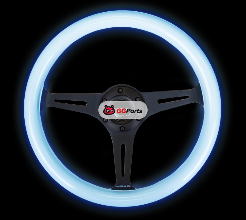 NRG Classic Wood Grain Steering Wheel (350mm) Glow-In-The-Dark Blue Grip w/Black 3-Spoke Center